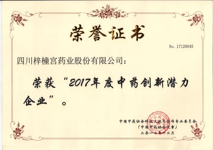 15 17-12熱烈慶祝四川梓橦宮藥業(yè)股份有限公司榮獲“2017年度中藥創(chuàng)新潛力企業(yè)”,并入選《中國中藥企業(yè)科技創(chuàng)新優(yōu)秀案例》和《2017年中藥企業(yè)科技創(chuàng)新文件匯編》!